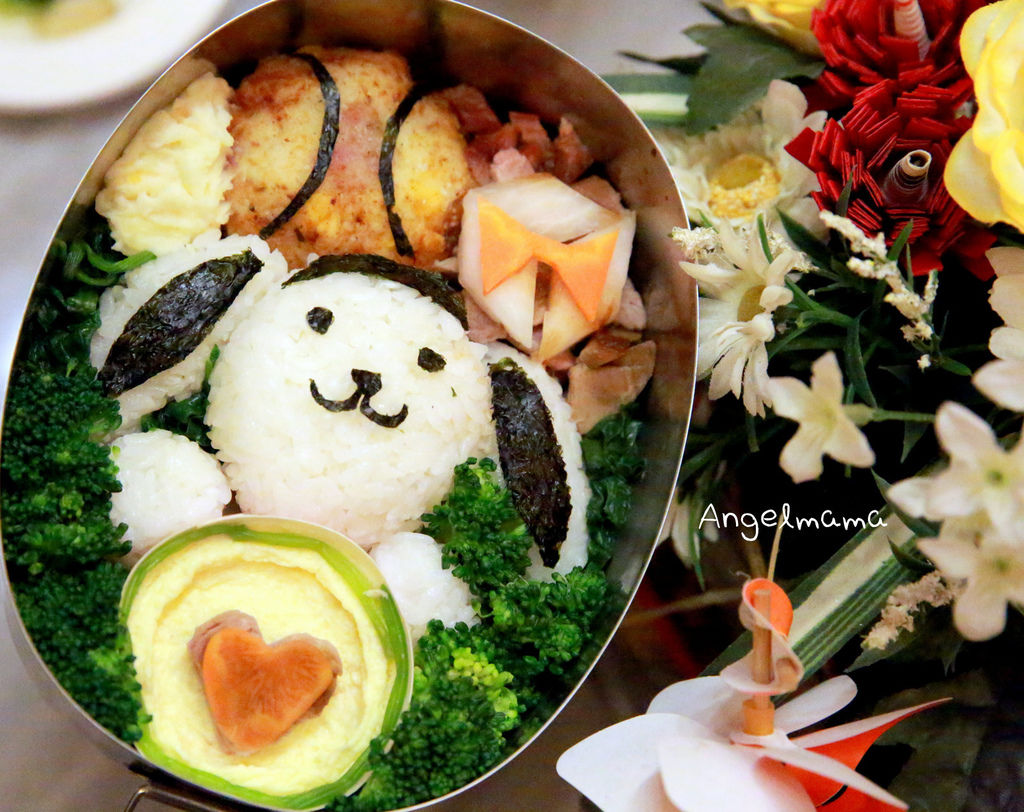便當內容物:狗狗白飯/蛤蜊蒸蛋/烤鴨肉/可樂餅/菠菜/紅蘿蔔/綠花椰菜/海苔/馬鈴薯泥/醃漬白蘿蔔